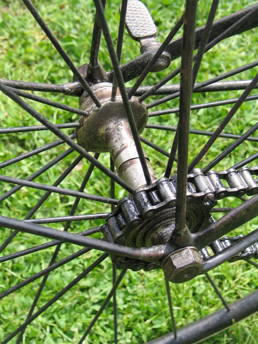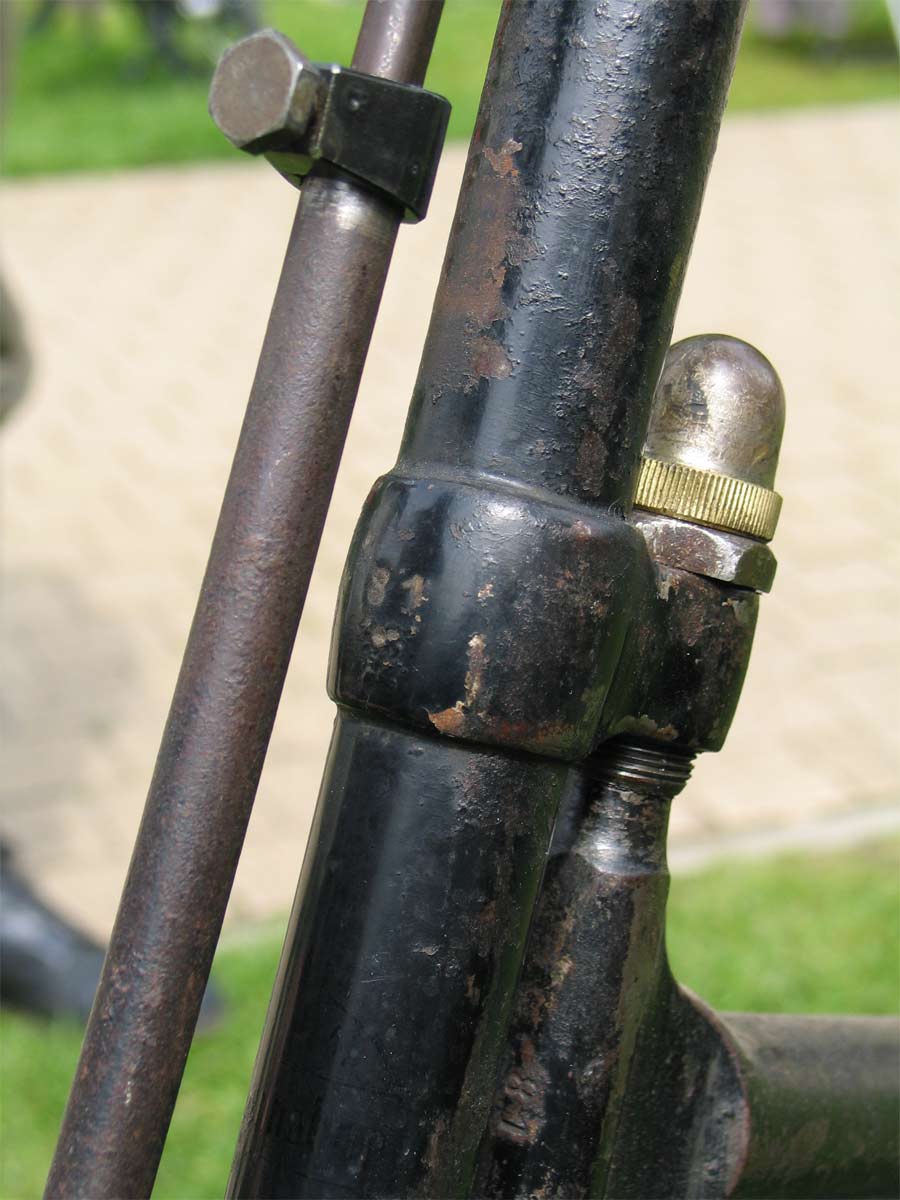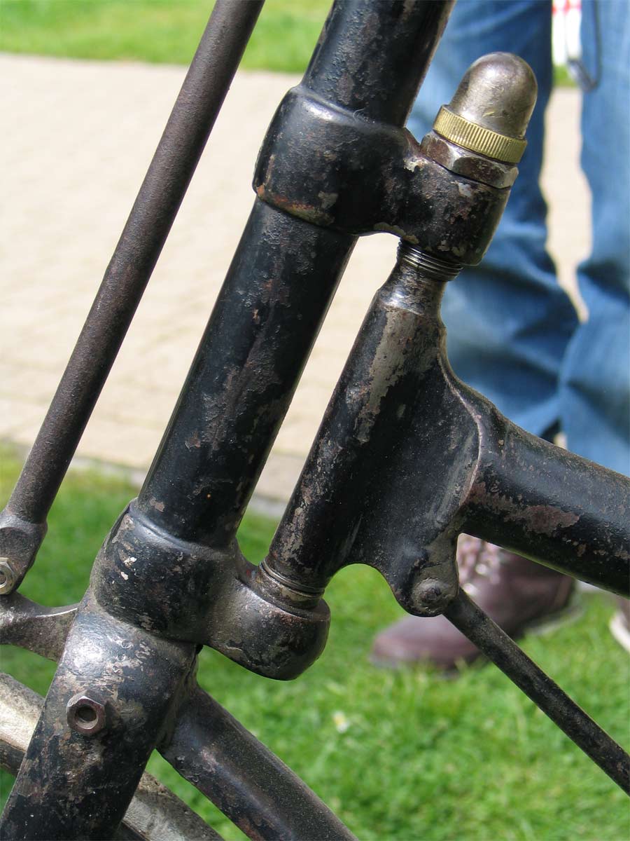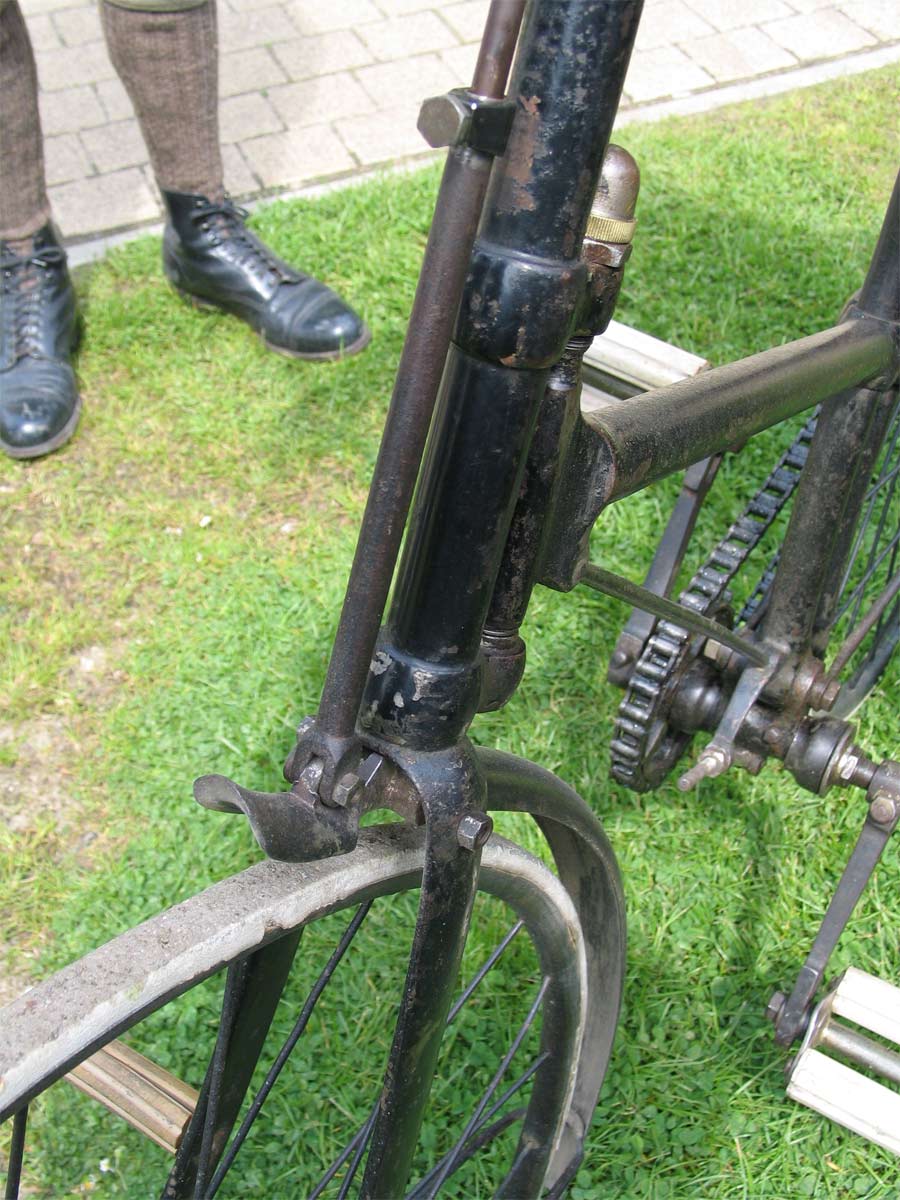 This cross frame is a marvellous survivor, with a lot of original details. Very characteristic step. Look at the original saddle! The only number we could find was '81' on the head tube. I guess it can't be a serial number, so it's a part number or maybe they started counting again with their safeties? We do not know the year of this bike, but 1890-1892 seems a good estimate.